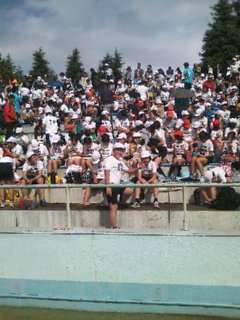 連合運動会は午前の部、女子の競技が終わりました。京西小の応援席は正面スタンド、本部横です。100メートル走のゴールが目の前にみえます。