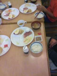 朝の献立です。納豆、ハム、玉子、切り干し大根、野菜、ご飯、みそ汁、ヨーグルト、リンゴです。いただきます。