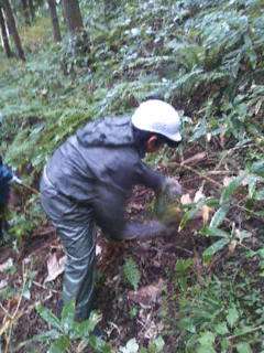 ぼさがり、じょばがりではなくぼさがりというそうです。山の斜面は足元が悪く作業するのに苦労します。リックをおろして頑張ります。