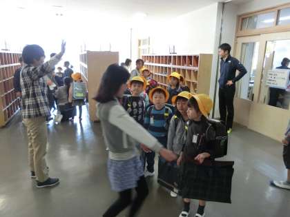 いよいよ本格的に学校生活がスタートする新入生を6年生が昇降口でお出迎えして教室まで案内してくれました。教室の中では、朝の支度の仕方も教えてくれます。1年担任がいなくても1年生が困らないようにサポートしてくれる頼もしい6年生。1年生は少し緊張気味ですが、優しいお兄さんやお姉さんがいてくれるので安心して登校することができます。