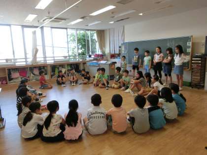 本校では1〜6年生まで全学年の子どもが入るグループを作って交流を深める「さくら組活動」を行っています。今日は今年度の顔合わせが行われました。自己紹介をした後に、みんなで楽しくいす取りゲームやハンカチ落とし、フルーツバスケットなどしました。1年生は始めこそ馴染めませんでしたが、やさしい6年生が上手にみんなの輪の中に誘ってくれて楽しく遊べました。
