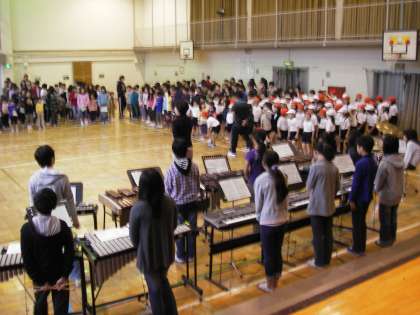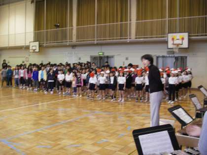 「どんなことばで かざるよりも いきるちからをもちつづけて はるかなそらには ……」子どもたちの素敵な歌声が体育館に響きます。曲は「この星に生まれて」です。