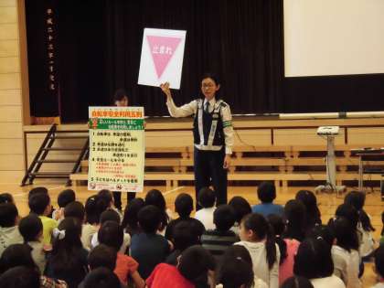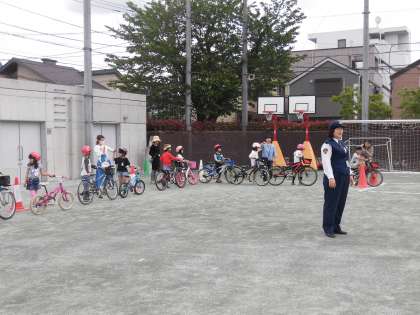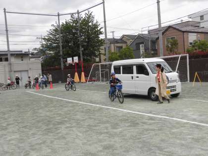 二子玉川警察署の方が来校され、交通安全について教えてくださいました。体育館では、警察官の方からお話をうかがったりDVDを見たりしながら、自転車の二人乗りはしていいのかな?自転車は歩道を走っていいのかな?自転車はどの信号を見るのかな?など交通ルールをしっかりと学びました。校庭では、道路脇に自動車が停車しているときの自転車の乗り方や、自転車での横断歩道の渡り方などを練習しました。