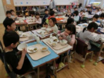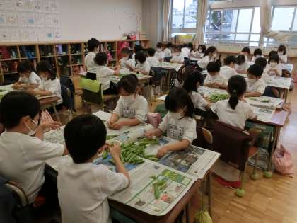 5月8日の給食は、ピースごはんでした。このメニューのために、1年生がグリンピースのさやとりに挑戦しました。初めてさやとりをした子も多く、悪戦苦闘していましたが、だんだんとコツが分かってきて、うれしそうです。どのクラスも上手に全校分のさやとりができました。ピースご飯の味は格別においしく、ぱくぱく頬ばっていました。何事も経験ですね。ご家庭でもチャレンジしてみてください。