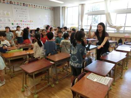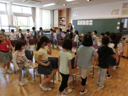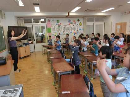 5月14日15日、1年生は初めての英語学習をしました。ALTのサンディー先生と英語であいさつをしたり、自己紹介をしたり、国旗をあてたりしながら、、楽しくスタートできました。