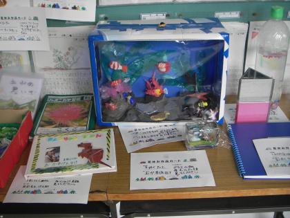 子どもたちが夏休みの間に挑戦し、作り上げた様々な作品が、教室の前の廊下に掲示・展示されています。