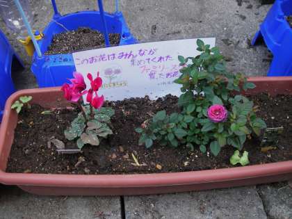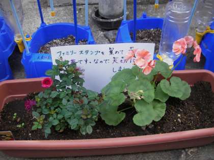 今、昇降口の前にプランターが並んでいます。エコ栽培委員会の子どもたちが植えた花が咲いています。花は、みんなが持ってきてくれたファミリースタンプを利用しました。用賀商店街でスタンプで勝ってきたものです。みんなの善意が花という形になり嬉しい取り組みです。