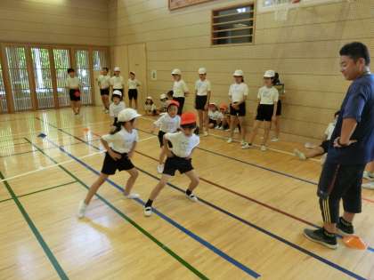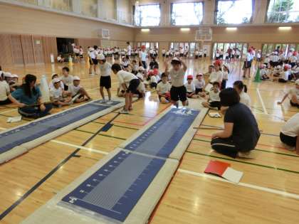 今日は絶好の運動日和となりました。全校児童が、青空の下でのソフトボール投げや、体育館での反復横跳びなどのスポーツテストを行いました。1,2年生がやる時は5,6年生が会場を案内したり、記録を取ったりと積極的にお世話をしてくれました。昨年度、本校は握力と立ち幅跳びに課題が見られました。そこで、それらを強化するために「京西サーキット」に取り組んできました。その成果が上がっていること期待しています!