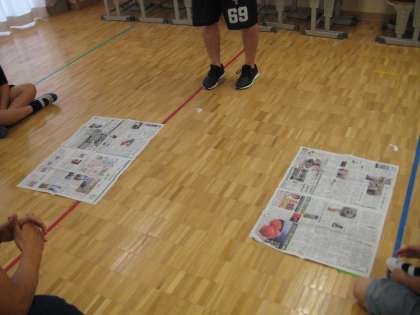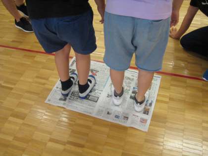 協力島のりゲームは、新聞紙を島に見立てて、2人でその上に乗ります。じゃんけんで負けたチームは、新聞を半分に折ります。半分に折っていき、乗れなくなったチームが負けです。今日は3回新聞を折ったところで、乗れなくなりました。2人で体を支え合ったり、片方がおんぶしたりするなど、工夫していました。
