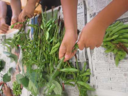 今日の1.2時間目に3年生がえだまめのえだとりをしました。今日の給食で使われる全校分36Kgのえだまめのえだとりです。おいしいゆでえだまめになるように、1つ1つていねいにえだとりを行っていました。