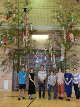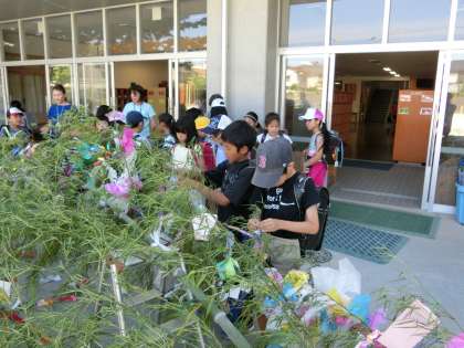 毎年、この季節恒例の七夕飾りが行われました。学校運営委員の高橋さんがご用意くださる笹竹に先月作った短冊や七夕飾りを付けて体育館に飾りました。体育館の高い天井に届きそうな大きな笹竹に色とりどりの短冊や飾りが付けられ、とても見事です。みんなの願いが叶いますように!!