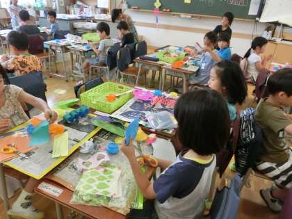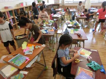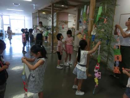 1年生は生活科「季節の行事」の学習で七夕飾りを作りました。一人一人が短冊に「水泳が上手になりますように」、「新体操で上手く踊れますように」などの願い事を書きました。短冊の下に飾りを繋げて長く立派な七夕飾りを作りました。1年生用の小さな笹竹も学校運営委員の高橋さんにご用意くださいました。おかげさまでとても楽しい学習ができました。