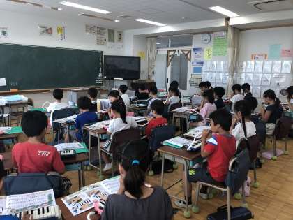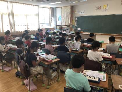 2年生は、昨年度と違い、今年は担任の先生が音楽の指導をしています。子どもたちは、歌を歌ったり、鍵盤の練習をしたりしています。