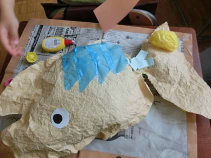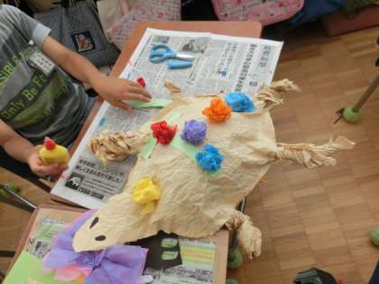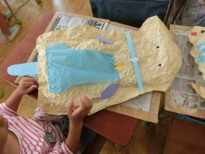 よくもんだ紙でふくろをつくり、中に新聞紙をつめて「お友達」をつくりました。形や色を工夫して完成させました。