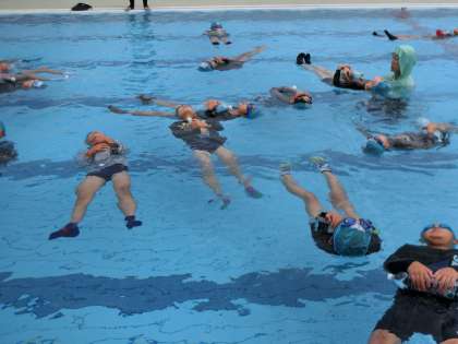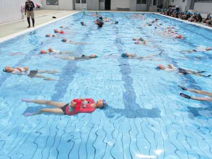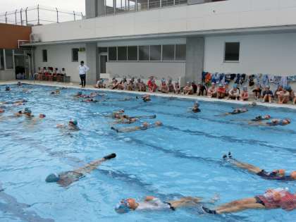 洋服を着たまま川や海などに落ちても自分の命を守る力を身に付けるために着衣泳を行っています。本校では、毎年3年生と5年生が行います。長袖の洋服に靴下を着けてペットボトルを持ってプールに入ります。ペットボトルを胸に抱えて仰向けになって3分間浮く練習をしました。万が一に備え落ち着いて行動するための心構えも学びました。