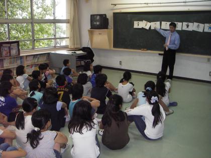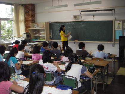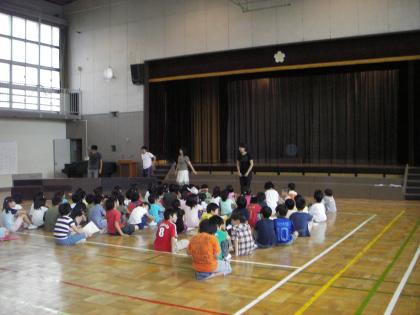 算数教室では5年生が算数「少数のかけ算」をやっています。体育館では2年生が、合同でワンダーランドに向けた練習をしています。総合科室では4年生がALTによる英語活動をしています。