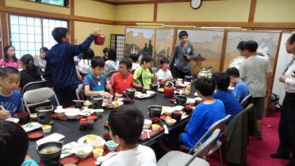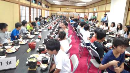 大広間で夕食です。 「おいしくいただいています」とのことでした。