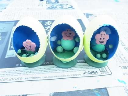 卵のからを入れ物にして、その中にねん土で作ったさくらちゃんを入れました。