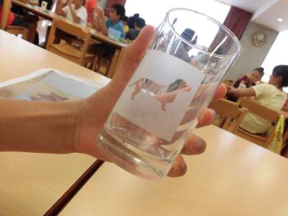 午前中は、2,5,6年生がサンドブラストを体験しました。コップに自分の好きな模様をはりつけ、特別な機械を使って、表面を砂でけずります。自分だけのオリジナルのコップが完成しました。