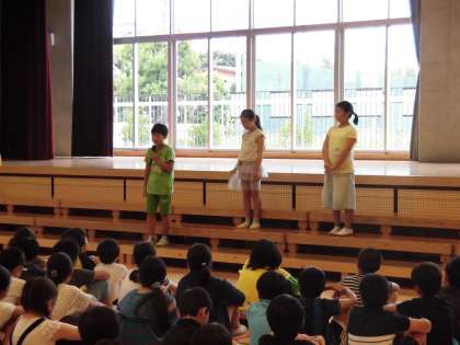 各クラス代表1名が、それぞれ今年の自分の頑張りを、みんなの前で堂々と発表しました。夏休みプールをがんばった様子や、自分の泳ぎについての振り返りをすることができました。