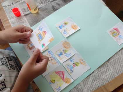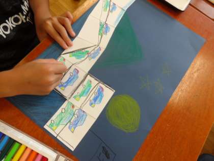 主人公は誰にしようかな。1つかいたらまた1つ、お話をどんどんつなげて絵をかきました。つくった作品を見せ合いながら、お話について説明し楽しみました。