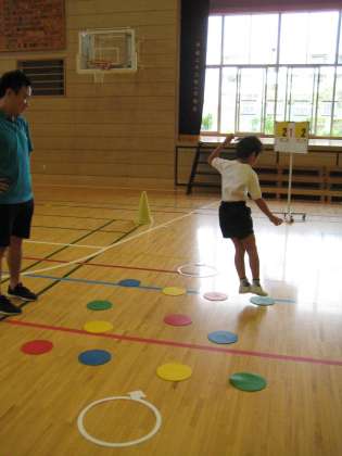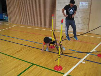 今日から、新しいサーキットトレーニングが始まりました。1つひとつの動きが複雑になり、1学期よりも指先や足先に神経を集中させて取り組まなくてはなりません。みんなが一番苦戦していたのは、張り巡らされたテープに触らずに、くぐりぬける課題です。最後の最後で手が触ってしまったり、足先が引っかかったりしていました。それでも何度もやり直しをし、全員クリアすることができました。
