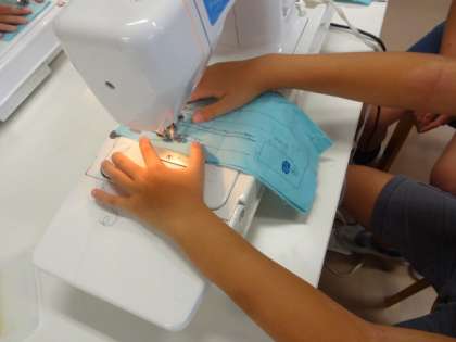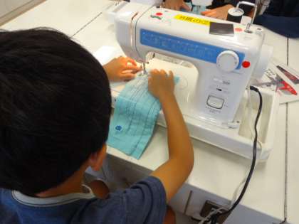ミシンの安全な使い方、上糸下糸のセットの仕方を学習して、直線縫いをしました。正しい姿勢で速度を調節しながら縫う練習を繰り返しました。