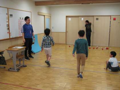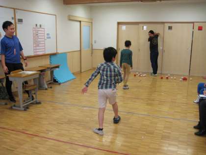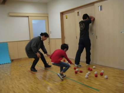 すまいるルームでは、「だるまさんがころんだ」ではなく、「だるまさんがはこんだ」です。鬼が後ろを向いている間に、鬼の周りにある紅白玉を運びます。動いてしまったら、スタート地点に戻ります。時間内により多くの紅白玉を運べたチームが勝ちです。1回戦目はピタっと止まれずにやり直しになる人が多かったですが、2回戦目はミスをしない人もいました。自分の体を自分でコントロールしたり、やり直しを受け入れて最後まで取り組んだりする力を身に付けます。