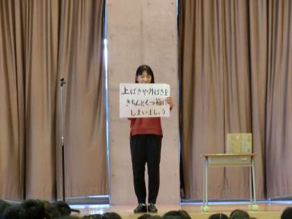 看護当番の先生から今週のめあて「きちんと靴箱にしまいましょう。」についてお話がありました。昇降口はいわば学校の顔です。きれいに使うことでみんなが気持ちよく生活ができます。デモンストレーションを交えて分かりやすく説明していました。おかげで靴箱の整理整頓が上手になりました。