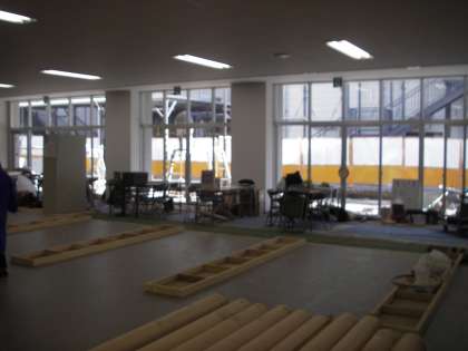 昇降口にはこれから靴箱が設置されます。昇降口は一つなので混乱しないように広々としています。正面の柱にはからくり時計が設置されます。からくり時計から流れてくる音楽は、京西さくら組、校歌です。正面階段の横には屋上の太陽パネルの発電量の表示と大きなモニターを設置する計画です。