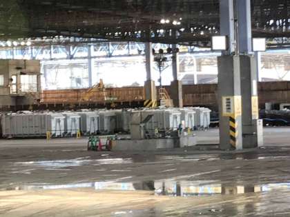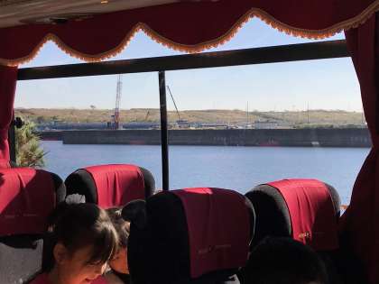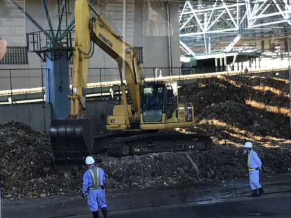 係員さんによる説明を聞きながら、バスで処分場の敷地内を見学しています。みんな真剣に話を聞いています。