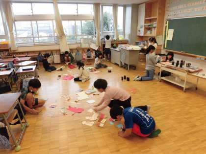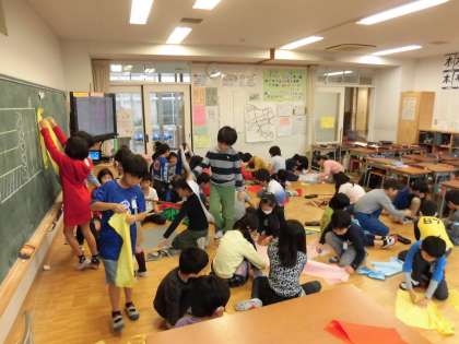 学芸会本番が来週に差し迫り、衣装を身に付けて練習するために、本日分担して、子供たち自身で作りました。