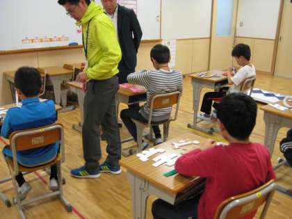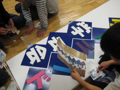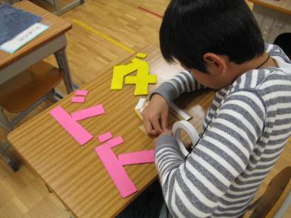 今日の仕事は、学芸会の看板を完成させることです。全員で完成図を見ながら、文字を配置していきます。「もう少し右にしたら?」「その位置でいいね」など、お互いに声をかけ合います。両面テープのゴミを友達の分まで捨ててあげたり、はがしにくそうにしている友達の手助けをしたり、自分から周りのために行動することもできていました。