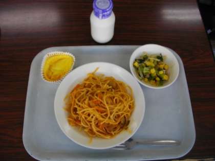 献立は「スパゲティナポリタン、小松菜サラダ、チーズケーキ、牛乳」です。