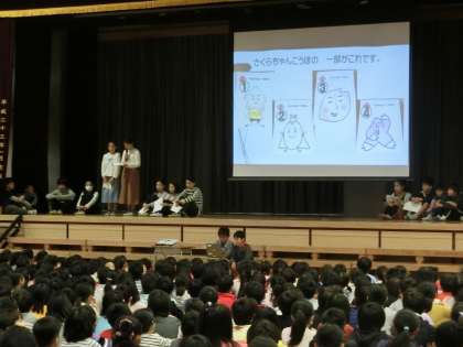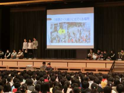 本校は明治12年12月10日に地元の有志の方々によって創立されました。今朝は139回目の創立記念日を前にして集会委員会の子どもたちが本校の歴史をクイズなどを交えてみんなに紹介してくれました。例えば、シンボルツリーの松が教室の札になっていること、古い校舎のこと、第2校歌「京西さくら組」やマスコットキャラクター「さくらちゃん」ができた経緯など139年間のトピックスを上手にまとめて紹介してくれました。
