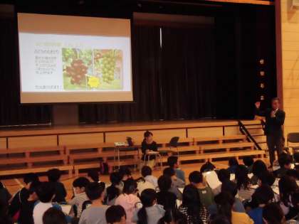 ぶどう農園を営んでいる3年生の子のお祖父さんがゲストティーチャーとして来てくれました。美味しいぶどうを作るためにはぶどうの成長に合わせてたくさんの手間をかけてお世話をする必要があることを教えてくれました。また、JAの仕組みや役割などについても詳しく説明してくれました。子どもたちはワークシートにびっしりメモをしていました。お忙しい中、お越しいただきありがとうございました!