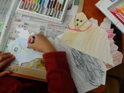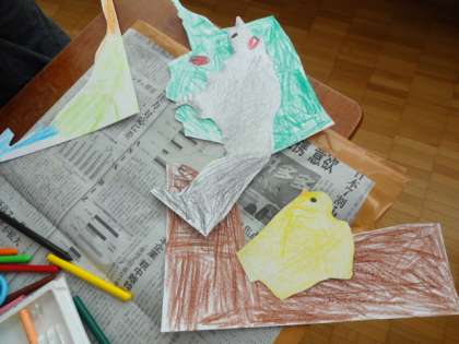 切り取った形を色々な向きから見てみよう。かくれていたよ、生き物、乗り物、使う物。形を見つけることを楽しみながら、絵をかきました。