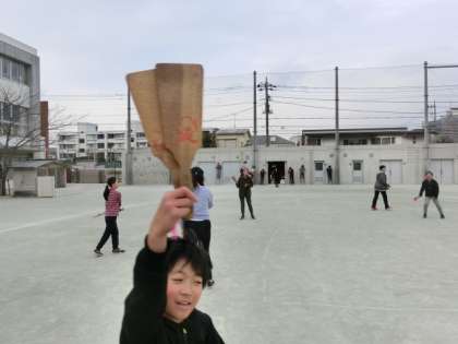 6時間目は屋外編です。羽根つきや竹馬などをして遊びました。