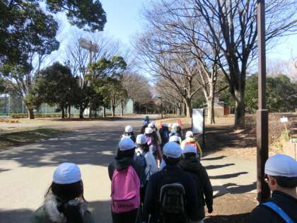 2枚の写真は、出発前の諸注意の様子と、公園に向かって歩く様子です。