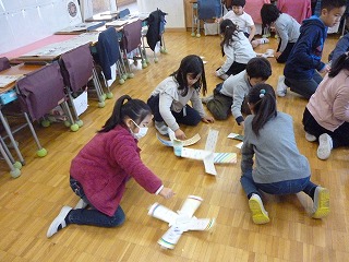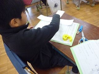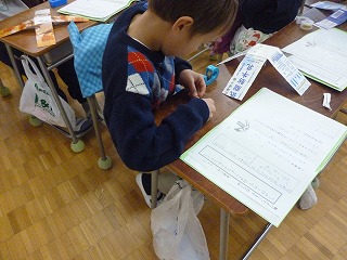 2年生は国語でこまの作り方の説明文について学習しています。教科書を読んで、自分でまとめて、自分でまとめたものを見てこまを作りました。言葉の意味を正確に読み取ることや図の大切さを実感する学習です。自分でまとめたものを見ながら作ったこまが回ったときには、とてもうれしそうでした。