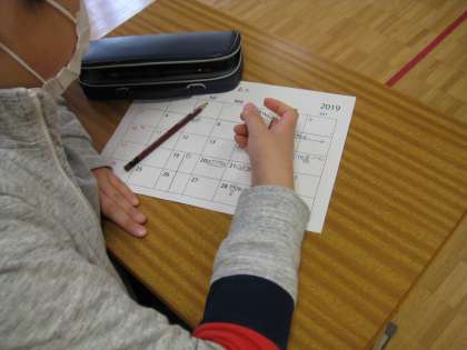 木曜日午後の高学年グループの「きく・はなす」では、「スケジュール」という活動を行いました。先生がするお話を聞きながら、”主人公”のスケジュールをカレンダーにメモしていきます。いろいろな情報の中で必要な情報だけを選んでメモする力をつけたり、記号や矢印を使って簡略化して表記する力をつけたりします。高学年らしく、工夫した書き方がいろいろと出てきました。