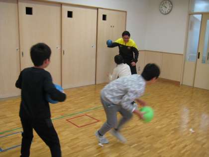 「大乱闘スマッシュボール」は、全員が敵のドッジボールです。1人1つずつボールをもち、他の人をあてにいきます。3回あたったら負けとなり、その場に座ります。何回あたったか、何回あてたかは、自己責任でカウントします。制限時間を意識しながら、周りをよく見て動き、駆け引きを繰り広げます。負けても勝ってもすぐに気持ちを切り替え、次の試合に臨みます。高学年らしい、白熱したバトルが行われました。