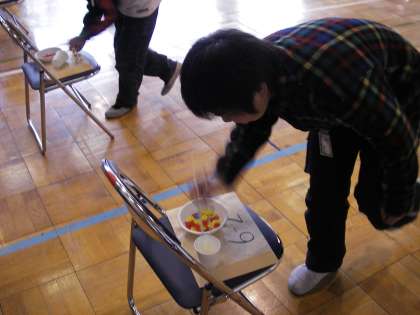 各クラス一人ずつ、スキップ、またはケンケンで前方に置いてあるお皿の所に行きます。豆の変わりのおはじきを1、2、3年はスプーンで4、5、6年は箸でコップに移します。