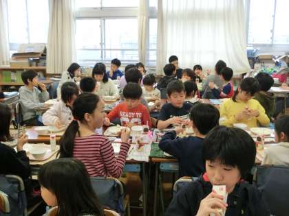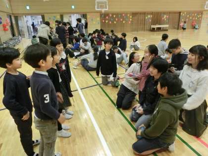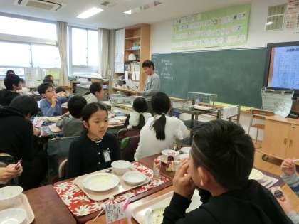 さくら組活動で1年間お世話になった6年生の卒業をお祝いしてみんなで給食を食べました。この活動ではこれまで6年生が企画、運営の全てをしてくれました。その6年生をゲストとしてお招きしました。いつも迎えに来てもらっていた1年生が、体育館で待っている6年生を教室までエスコートしました。4年生は6年生の席に置く名札を作り、5年生が給食当番と司会進行をしました。さくら組活動のバトンも6年生から受け継がれました。