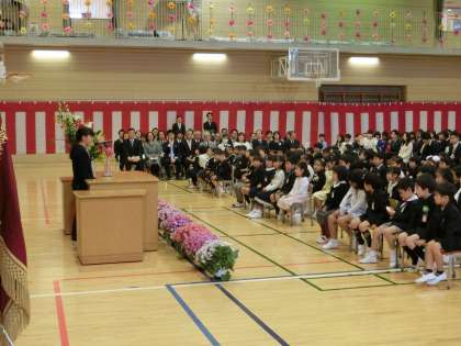 入学式に参加してくださったお客様を代表してPTA会長、在校生を代表して6年生の子どもがお祝いの言葉を述べてくれました。学校生活を送るうえでとても大切なことをお話ししてくれました。2年生は学校の様子を紹介した後に「京西さくら組」を手話付きで披露してくれました。とても上手でした。