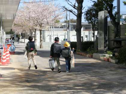 自分の背中より大きなランドセルを背負ってかわいい1年生たちが登校してきました。後ろ姿を見るとランドセルが歩いているようにも見えます。桜吹雪が舞うさくら通りをどのような思いを抱いて通ったのでしょうか。今はドキドキしながら通っている子もきっと大丈夫!6年生や先生方が強い味方になってくれます。