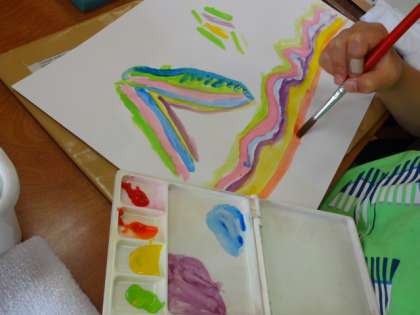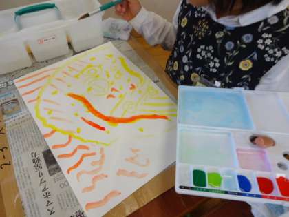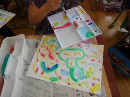 「えのぐじま」という言葉から、思いついた形や色を絵の具で表現しました。水の量や筆の使い方を工夫しました。色の組み合わせ、点・線の表し方など、絵の具でぬることを楽しみました。