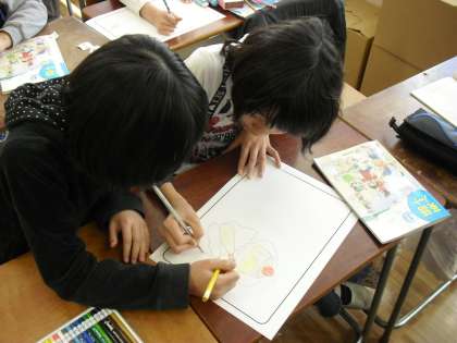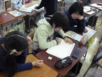グループでこんだてを考えています。それぞれのグループで絵を描き、英語で練習します。寿司があったり、サラダがあったり、フカヒレスープがあったりと様々です。