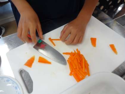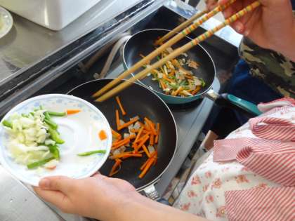 フライパンを安全に使い、「野菜炒め」を作りました。野菜の切り方、いためる順番に気を付けて調理することができました。