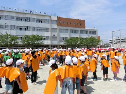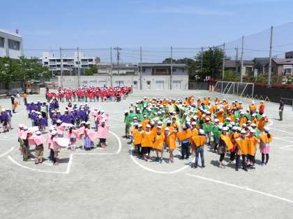 140周年記念の文集や下敷きなどに載せるために航空写真を撮りました。カラフルなエプロンを身に付けて校庭いっぱいの大きさのさくらちゃんを全校のみんなで描いたら、上空を飛ぶセスナ機に乗ったカメラマンが撮影をしてくれるのをじっと待つだけです。出来上がりが楽しみです!!